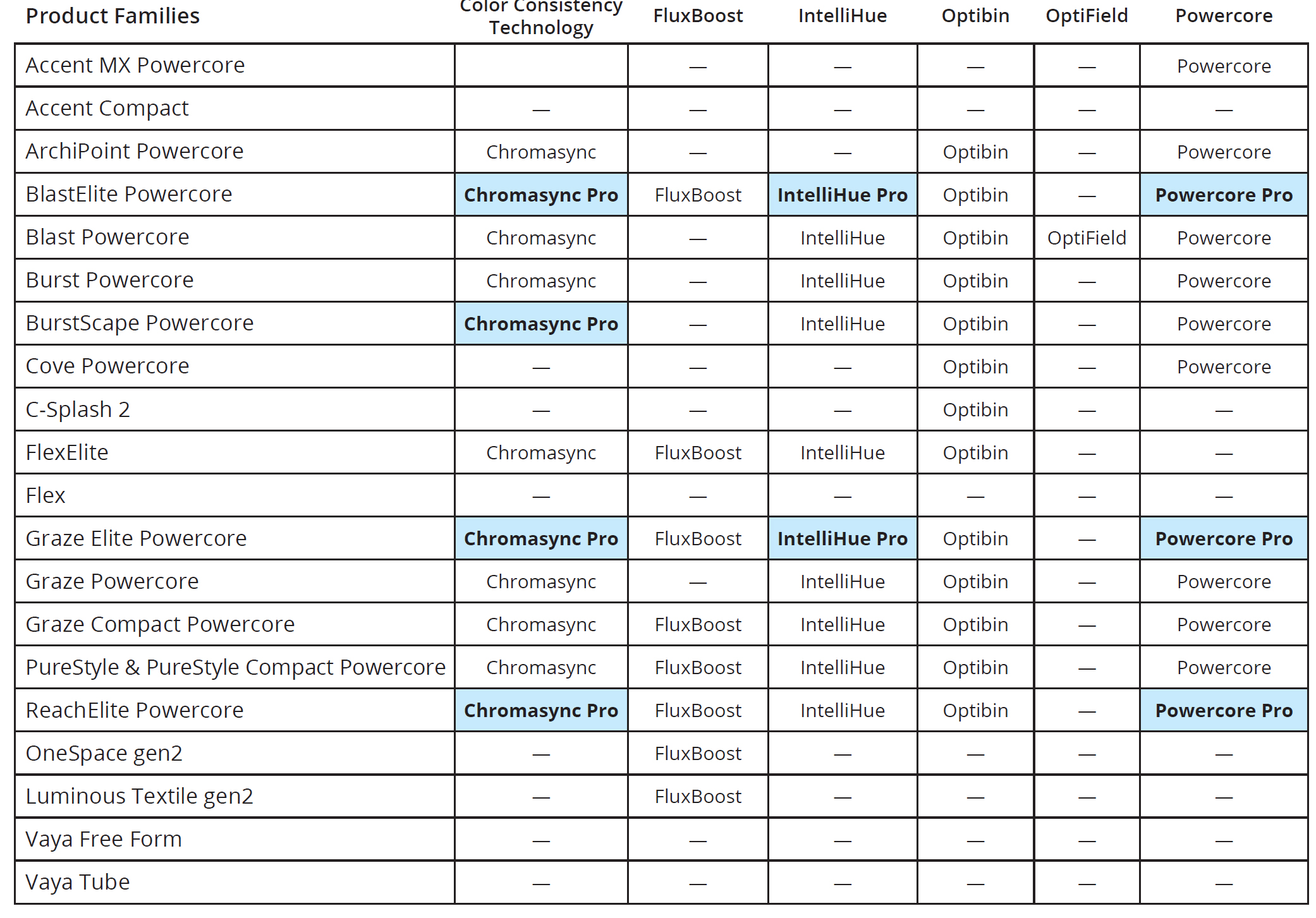 - Maximized output. Chromasync Pro and FluxBoost—our intelligent algorithm that boosts the output of multi-channel LED luminaires—give you significantly more output, saturation—and value.