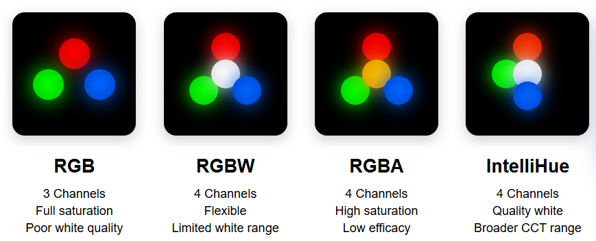 RGBA chose saturation over refinement. Brilliant at low CCTs. The compromise? Low efficacy and limited white quality.