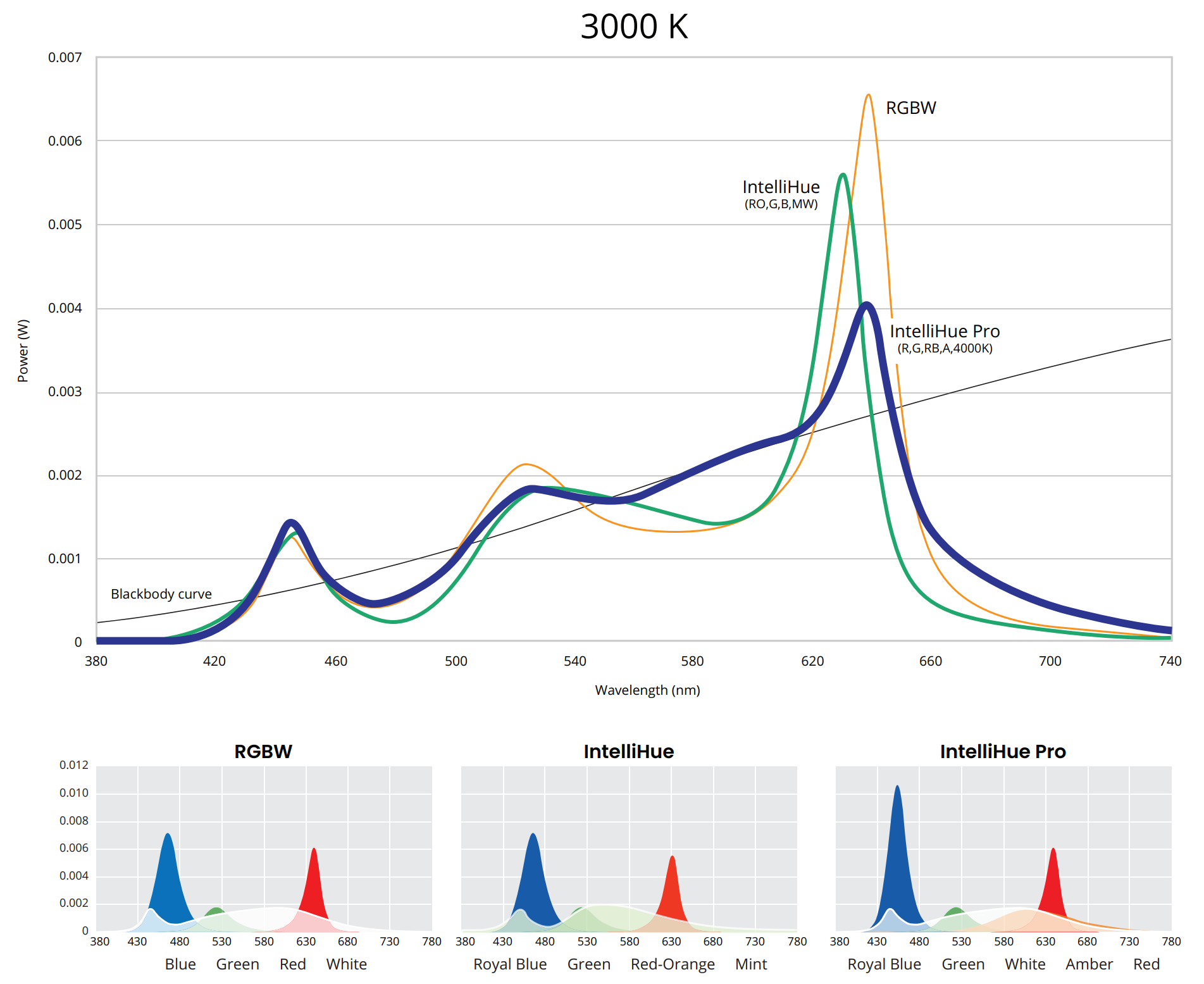 Design with confidence. IntelliHue Pro achieves 90 CRI and 70 R9 across the entire Blackbody range—2200K to 6500K. Full color saturation. Exceptional white quality. No compromises. No limitations.